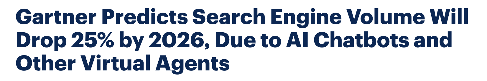 [2] Gartner - Gartner Predicts Search Engine Volume Will Drop 25 Percent by 2026, Due to AI Chatbots and Other Virtual Agents. https://www.gartner.com/en/newsroom/press-releases/2024-02-19-gartner-predicts-search-engine-volume-will-drop-25-percent-by-2026-due-to-ai-chatbots-and-other-virtual-agents